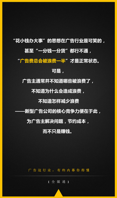 “花小錢辦大事”的思想在廣告行業是可笑的,甚至“一分錢一分貨”都行不通,“廣告費總要被浪費一半”才是正常狀態。可是,廣告主通常并不知道哪些被浪費了,不知道為什么會造成浪費,不知道怎樣減少浪費——新型廣告公司的核心競爭力便在于此,為廣告主解決問題,節約成本,而不只是賺錢。