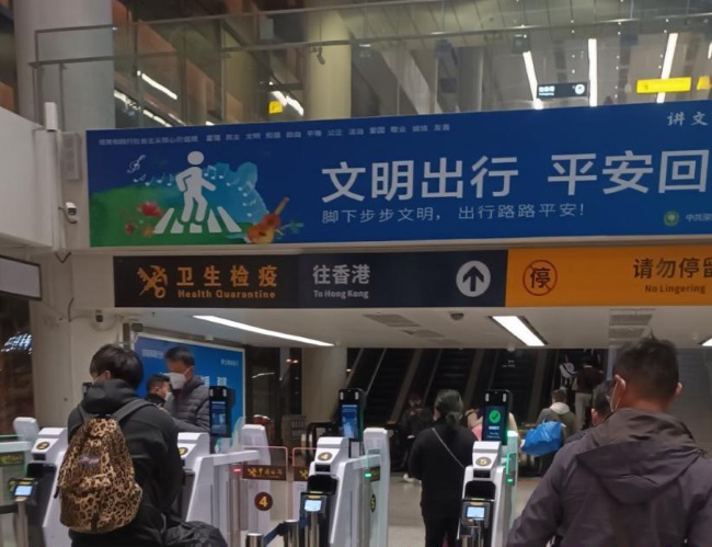 福田口岸一夾層大廳扶梯閘機口旁旅客出境方向燈箱廣告