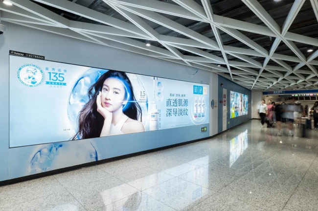 崗廈北站作為深圳地鐵客流量最大的地鐵換乘站點之一,乘客途經通道換乘過程中通常容易把注意力集中在周邊環境而非手機。必經通道和龐大客流量的聚集區域品牌首發,采用燈箱搭配墻貼的媒體形式,組成超級品牌墻,視覺效果沖擊力強,將乘客帶入廣告場景,品牌存在感極強,給受眾留下深刻的品牌印象。地鐵燈箱廣告高明亮度、高清晰度呈現廣告畫面,展示面積巨大、視覺上更具沖擊力,產品形式多樣、有豐富的創意延伸空間,營造沉浸式的品牌氛圍。