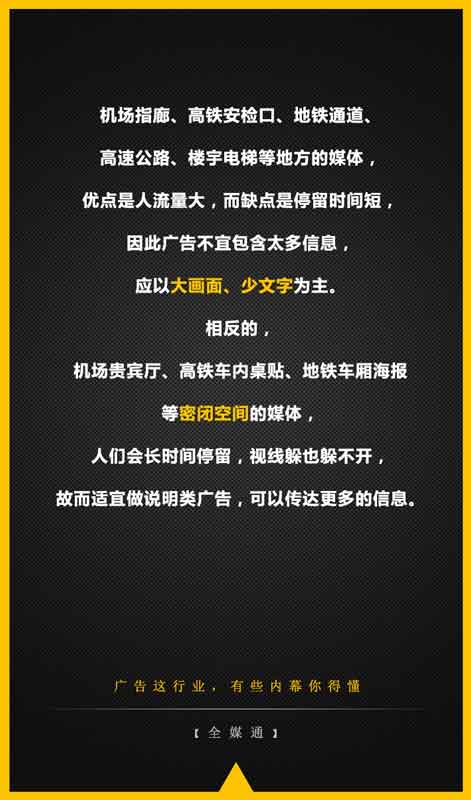 機場指廊、高鐵安檢口、地鐵通道、高速公路、樓宇電梯等地方的媒體,優點是人流量大,而缺點是停留時間短,因此廣告不宜包含太多信息,應以大畫面、少文字為主。相反的,機場貴賓廳、高鐵車內桌貼、地鐵車廂海報等密閉空間的媒體,人們會長時間停留,視線躲也躲不開,故而適宜做說明類廣告,可以傳達更多的信息。