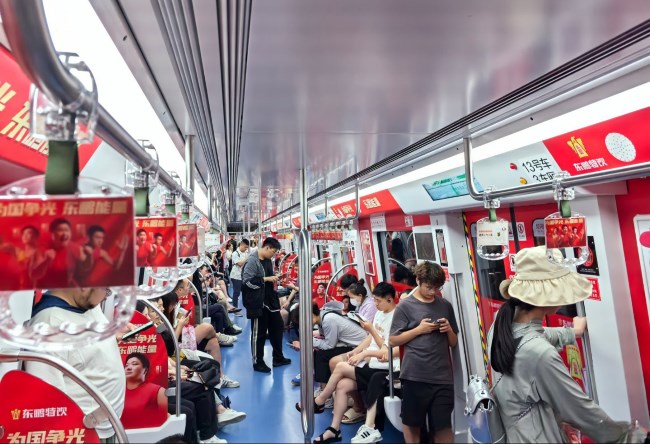 福州地鐵內包車廣告常規6節車廂全面覆蓋媒體數量多,廣告展示面積大畫面連貫品牌沖擊力強,是一種展示效果極佳的地鐵廣告形式。本次全仔帶來的案例來自東鵬特飲奧運宣傳,經典中國紅的喜慶底色與產品金黃色的外觀形成強烈視覺沖擊,廣告畫面呈現運動健兒力與美,搭配簡單又朗朗上口的廣告詞,選擇奧運會營銷節點集中發布在2號線車廂內,易形成話題。