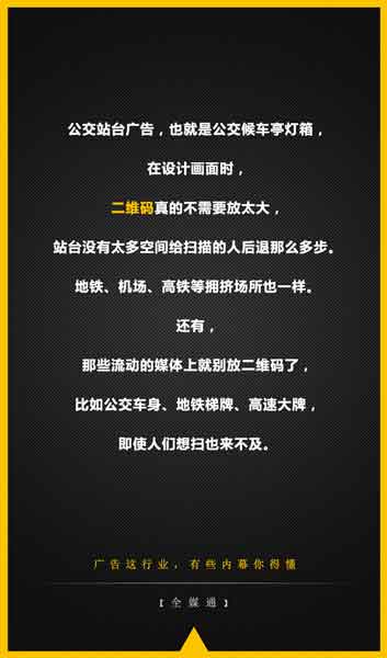 公交站臺(tái)廣告,也就是公交候車亭燈箱,在設(shè)計(jì)畫面時(shí),二維碼真的不需要放太大,站臺(tái)沒有太多空間給掃描的人后退那么多步。地鐵、機(jī)場、高鐵等擁擠場所也一樣。還有,那些流動(dòng)的媒體上就別放二維碼了,比如公交車身廣告、地鐵梯牌廣告、高速大牌廣告,即使人們想掃也來不及。