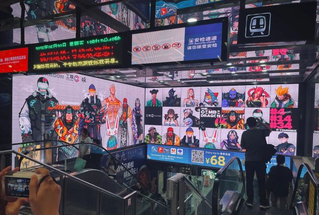 杭州地鐵龍翔橋站C出入口LED大屏廣告梯頂與側墻無縫覆蓋,屏體距乘客僅1-3米,畫面沖擊力遠超遠距離大屏,尤其扶梯下行時,乘客視線正對屏幕,閱讀時長充足,廣告觸達效率極高。46平方米L屏同時覆蓋垂直扶梯上行仰視視線與通道水平行進平視視線,形成立體化視覺包裹,消除單一角度盲區。超近觀看距離與特殊L形結構帶來的視覺記憶深度遠超傳統媒體。