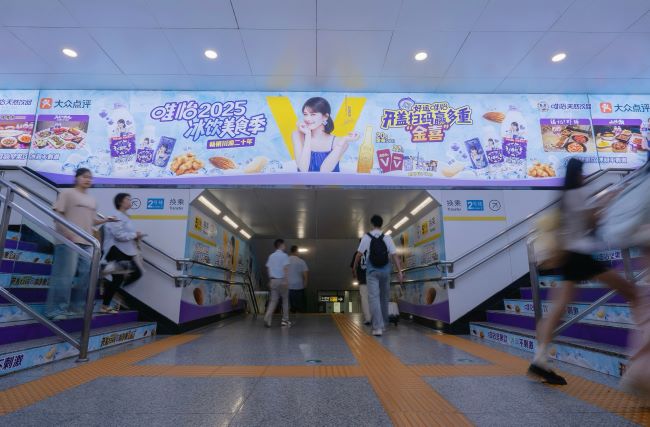 長沙地鐵萬家麗廣場站換乘品牌通道廣告覆蓋2號線轉5號線、5號線轉2號線雙向客流。2塊梯眉燈箱位于樓梯正上方,乘客仰視上下樓梯時視線自然鎖定,單次閱讀時長 5-8秒;55㎡雙側墻面貼形成“視覺長廊”,雙邊樓梯立面貼沉浸覆蓋,乘客步行通過全程持續接觸廣告,總曝光時長 40-60秒/人次。立體視覺包圍、動線無遺漏觸達、場景化閉環轉化等優勢在乘客消費決策關鍵節點實現深度滲透。“必經過道+商圈直連”屬性特別適合快消、零售、文旅及本地生活品牌。