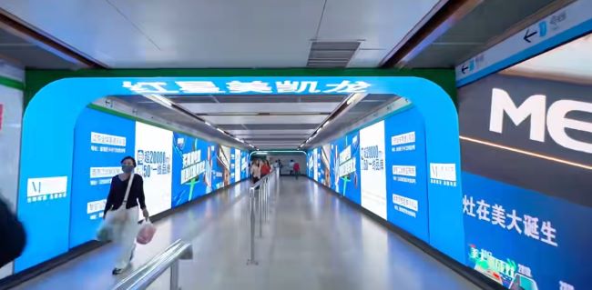南京地鐵南京站換乘通道墻面廣告多媒體組合視覺統治力,4塊LED屏支持視頻內容,在昏暗通道中形成強光效焦點,8塊燈箱沿通道線性分布,構建"視覺長廊",3座拱門結構強化區域過渡感,自然分割不同廣告內容板塊。針對1號線轉3號線、3號線轉1號線雙向客流,多媒體組合確保各方向乘客均能接觸2-3個廣告點位。