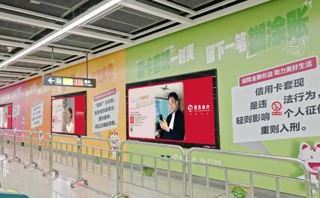 貴陽地鐵品牌墻廣告利用站廳或通道的整面主體墻面進行墻貼與燈箱的聯封發布。這種組合形成了超長尺幅的視覺畫面,在乘客行進動線上產生強烈的視覺沖擊力。品牌墻通過大面積的連貫畫面,能夠對乘客形成立體化的視覺包圍感。結合燈箱的光效,廣告內容在站內照明條件下色彩呈現鮮明,進一步增強了廣告的醒目度和記憶度。以墻貼結合燈箱的形式在主題站廳或通道內進行整體布局,形成了陣列式的媒體矩陣。這種規模化的展示不僅提升了品牌形象的統一性和氣勢,而且能夠對持續流動的乘客進行反復、持續的視覺提示。