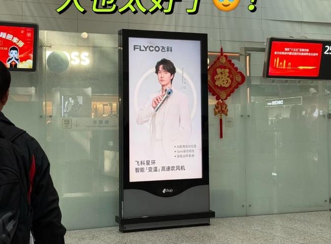 案例呈現:飛科在此投放了王一博手持新款“星環智能變溫吹風機”的巨幅畫面。白色背景與中心光環設計,在嘈雜的機場環境中營造出一種純凈的科技美學,瞬間拉升品牌檔次,為后續的安檢排隊預熱。