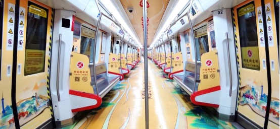 石家莊地鐵列車總長約140米,共6節車廂,單節列車長22.8米,車輛最寬處3.1米,沉浸式專列包括頂貼、地貼、門貼、墻貼等10處資源,總面積約916㎡,品牌可用展示空間大。