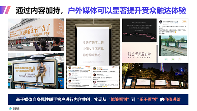 消費者在傳播中的地位增強,推動戶外媒體角色升級:從展示和放大信息的單向媒介,升級為用戶與品牌情感溝通的【交互通道】。通過內(nèi)容加持,戶外媒體可以顯著提升受眾觸達體驗;借助戶外場景,釋放內(nèi)容能量,也能讓傳播更加深入人心。