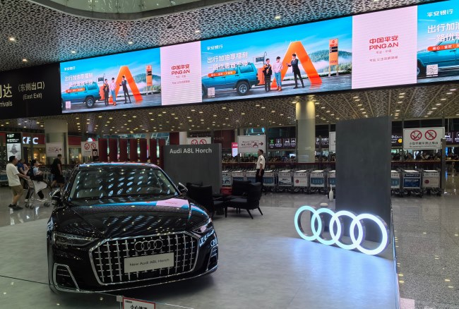 深圳機場國內到達行李提取廳出口上方LED大屏廣告位于出口隔斷玻璃門上方,與交通導示面板平行,正對國內到達深圳的全部旅客視線,大屏背后為接機等候人群。寶安機場出口LED橫屏廣告橫長30米,面積達99平方米,巨大的廣告畫面完美展現(xiàn)品牌信息,宛如一張巨型品牌名片展現(xiàn)在來到深圳的旅客眼前。位于高處離地近7米,視線良好可視范圍廣,直面沖擊旅客視線。
