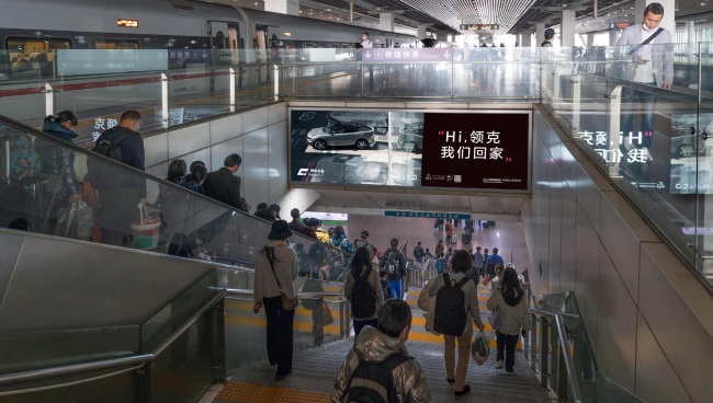 廣州南站站臺到達層出站通道扶梯上方楣頭燈箱廣告正對出站人群搭乘扶梯和走樓梯客流。覆蓋出站所有人群,且媒體與人的視線呈垂直角度,廣告效果比較直觀,出站旅客有一定的時間停留性。燈箱廣告面積較大,既可用作扶梯電梯進出站方向指引,亦可充當照明設備,在較暗的站臺環(huán)境中發(fā)光非常醒目。視覺沖擊力強。聯(lián)排套裝投放彰顯品牌形象,提高有效曝光率。