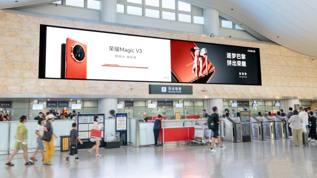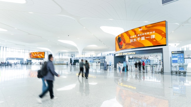 杭州機場T3安檢口正上方LED屏廣告,垂直覆蓋旅客排隊等候區,T4航站樓弧形屏精準匹配國際/國內雙流線,利用弧形曲面實現160°廣角覆蓋,同步觸達辦票、行李托運及安檢預備人群。