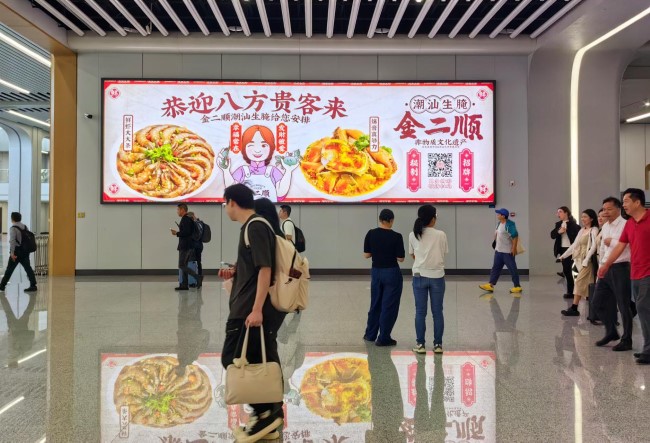 汕頭高鐵站出站口墻面燈箱廣告2塊32㎡視覺巨幕:單塊10米通長畫面構建水平視覺長城,3米超近距離占據旅客70°水平視野,畫面填充率超85%。步行出站期10米長幅畫面形成連續性視覺牽引,接客等待期畫面細節觸發深度信息解碼,交通選擇期租車/酒店服務/餐飲門店等信息即時轉化。旅客自遠及近行走時,10米長畫面分三段品牌認知→產品展示→行動指令遞進式傳遞信息。