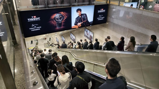 上海虹橋站站臺層出站扶梯梯頂燈箱廣告高度與扶梯下行旅客視線平齊,燈箱橫長超5米的橫向畫面在狹長通道中形成視覺包裹效應,旅客無需仰頭即可全幅接收信息。梯頂位置規避周邊廣告干擾,結合扶梯行進方向,確保廣告成為 視野焦點,閱讀率較普通區域提升40%以上,旅客乘扶梯時平均停留時間約 20-30秒,處于行程轉換期的“注意力空窗”,廣告信息接收效率顯著提升。6組30塊燈箱沿出站動線分布,形成連續視覺矩陣,旅客無論從哪個站臺出站均被廣告包圍,規避觸達盲區。
