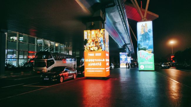 張家界機場航站樓出口門廊包柱燈箱廣告同時覆蓋到達機場的旅客以及接機人群,6根立柱在兩條行車道中間形成一道強大的視覺矩陣。無論旅客和接機人員從哪個方向走來,或是車輛從哪個車道駛入,都無法避開廣告畫面的包圍,實現了真正意義上的全景式無遺漏觸達。多根立柱聯排展示,其規模化的視覺延伸效應遠勝于單根立柱。4.6米的高度在戶外環境中形成強烈的視覺統治力,結合無邊框全景燈箱的設計,畫面整體感和視覺沖擊力非常突出,能第一時間抓住所有人的注意力。