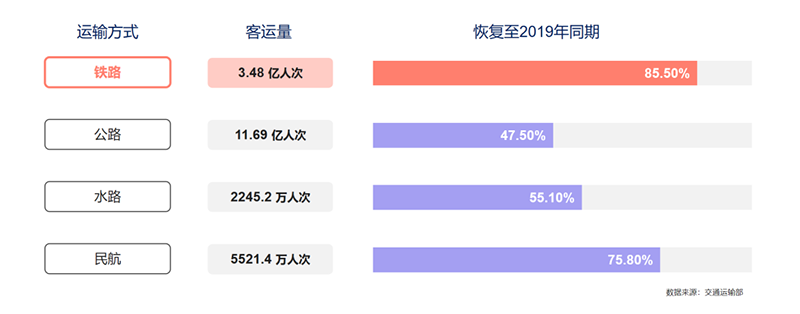 根據交通運輸部數據顯示,2023年春運期間「鐵路運輸客運量」3.48億人次,客運量人次已恢復至疫情前2019年同期85.5%水平,在營運性運輸方式中一枝獨秀。