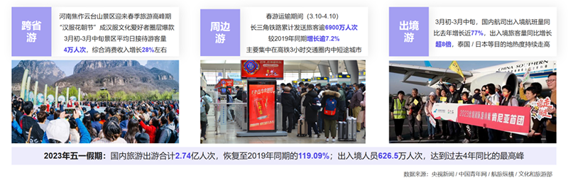 春暖花開,民眾積蓄已久的出游熱情正在加速釋放。我國旅游市場呈現穩開高走態勢,跨省游 / 周邊游 / 出境游均有序復蘇,各地開展一系列惠民措施, 通過發放旅游消費券等助力文旅市場消費回暖。