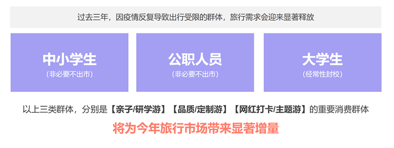 乙類乙管后,跨省游 / 跨境游不再受限,沉寂許久的長線游開始復蘇, 少出門慎旅游心態加速化解,跨省遠途旅行重新回歸—— 旅游消費呈現 「走得更遠、待得更久、消費更多」的新特點。 擱置已久的長線旅行,今年將重新回歸更多人的計劃清單,有望成為旅游市場強勁增長點。
