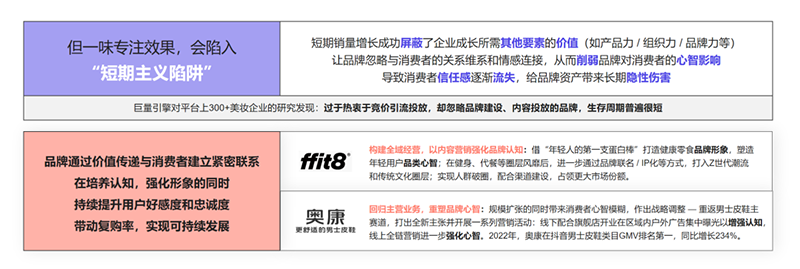 不能因?yàn)槎唐跇I(yè)績提升,忽略品牌長期健康發(fā)展,持續(xù)的品牌建設(shè)是賦能生意增長的重要手段。無論傳統(tǒng)品牌還是新消費(fèi)品牌,越來越多的品牌主正在重新回歸品牌建設(shè)之路。