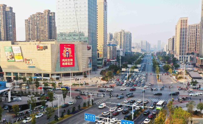 長(zhǎng)沙王府井百貨主屏LED大屏廣告地標(biāo)占位,384㎡巨幕形成河西制高點(diǎn),500米外清晰可辨,144㎡屏體輔屏近距補(bǔ)充,針對(duì)路口緩行車輛及行人。金星大道南北向車流直面主屏,桐梓坡路東西向車流及過街人流同步觸達(dá)輔屏,消除視角盲區(qū)。