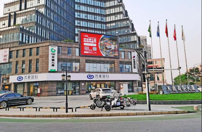 佛山順德龍江王鼎商務大廈戶外LED大屏廣告71.7平方米的屏幕尺寸在交叉口環境中尺度適宜,視野開闊,能夠確保來自不同方向的車輛和行人在有效距離內清晰辨識廣告內容。其次,由于地處紅綠燈路口,車輛和行人在此自然停頓,等候時間較長,為廣告內容提供了難得的完整展示機會,使15秒的廣告信息能夠被充分接收。